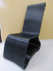 光沢のある表面と3Dプリンター特有の積層痕がきれいに映えます。肘置きと座面は木で、造形時間は10時間ほどです。